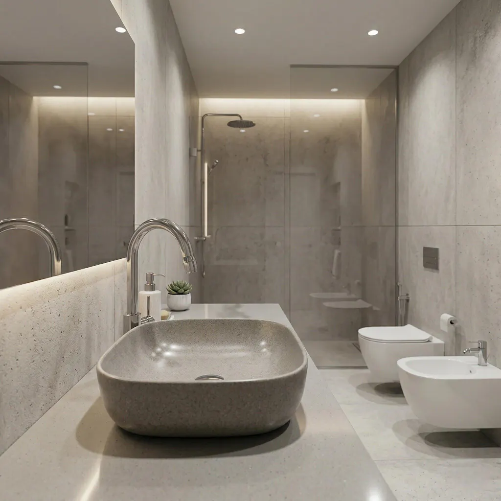 Handmade rectangular vessel sink crafted from durable stone composite material. Designed for modern, minimalist and luxury bathrooms, this countertop sink combines natural texture with a clean geometric form. Each piece is individually cast and finished by hand, making every sink unique. Suitable for residential and commercial bathroom interiors.